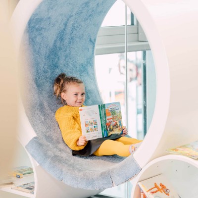 By using reading furniture with tablets and a large selection of children’s books that invite you to read and tell stories